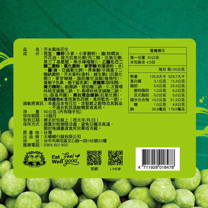 ▶️成分:花生、麵粉、棕櫚油、乙醯化己二酸二澱粉、氧化澱粉、麥芽糖、鹽、芥末粉、麥芽糊精、脂肪酸甘油酯(植物性)、、蔗糖素、美力精粉、抗氧化劑、食用綠色B。