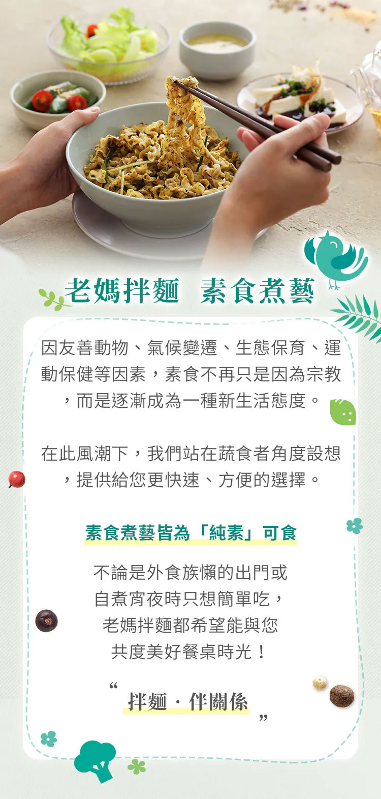 「老媽拌麵」秉持回歸食材原味精神,每項產品採用天然食材製造,堅持不添加人工香料,為支持本土農產品,使用在地好食材不斷研發獨創口味,以做出「食物級食品」為品牌的核心價值,日曬關廟麵Q彈快熟不軟爛的特性,搭配精製醬包,只要4分鐘就能享受即食的美味,透過網路無國界傳播目前全球已開發多個販售通路,以讓華人市場都吃得到道地中華美食為願景,讓一碗簡單的拌麵,吃出美味、吃的健康,吃得到家鄉的味道。