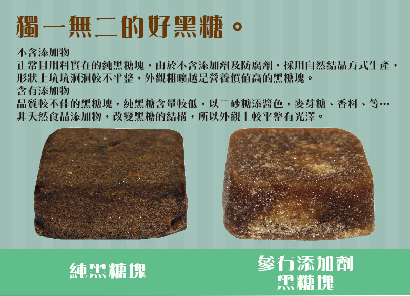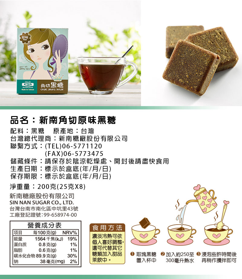 ★黑糖為甘蔗製糖上第一道產品, 一般顏色較深,呈粉狀且有較多雜質,富涵營養;黑糖再次精煉結晶,則製成紅糖。 ★現代人流行養生,而早期食品的製作原料單純,因此那些阿嬤級的零食則因此再度爆紅。私人產業的新南糖廠已有60多歲,但至今仍保留傳統製程,製作真材實料的黑糖。 ★外型粗獷的黑糖,對女性卻是很好的食品。第三代經營者楊經國說:「黑糖是鹼性食品,可改善體質、降火氣。而女性在生理期,食用溫熱的黑糖水則可幫助補血、減少經痛。」 ★黑糖不僅好處多,還發揚光大了別人家的特產,聽南化鄉長說:「澎湖著名的黑糖糕,原料中的黑糖是來自新南糖廠呢。」