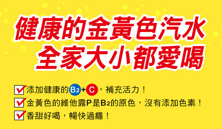 金黃色的維他露P,有健康的B2 和C,無添加色素。天天喝,讓你充滿陽光般的活力。